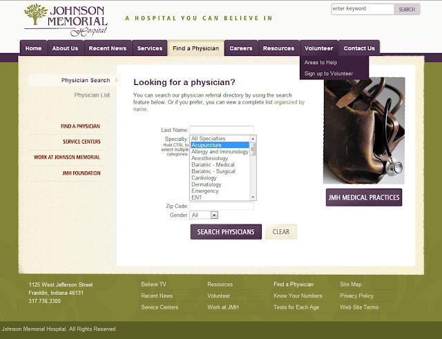 These types of links include “how to find us”, “how to become a patient”, “how to find your provider”, “pay bills”, “registration”, etc. These links are important to have because they are more than likely the top reasons visitors have come to your website. These links are often separated out somehow in the design and important to be easy, clear, and on many pages of the website.