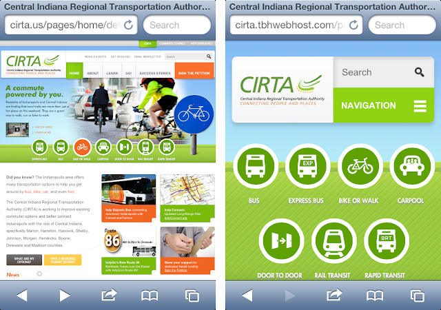 CIRTA.us is an example of a user-friendly mobile website we recently re-coded responsively for better mobile presentation. On the left is their previous desktop site squeezed into a mobile screen–it looked fine but was difficult to read, click, or find information. On the right is their revised responsive mobile website which offer big buttons and clear options. |