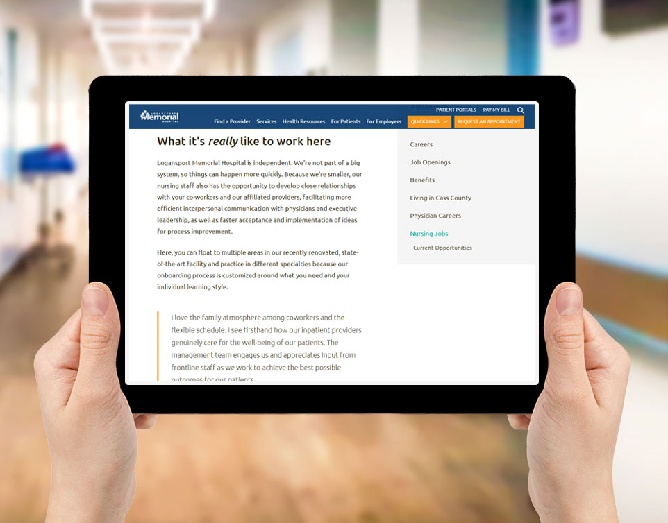 In 2019, our client Logansport Memorial invested in website upgrades to improve their online recruitment strategy. We built a new page on the site called “Nursing Jobs” to showcase the hospital’s workplace culture and benefits available to new employees, as well as available opportunities.